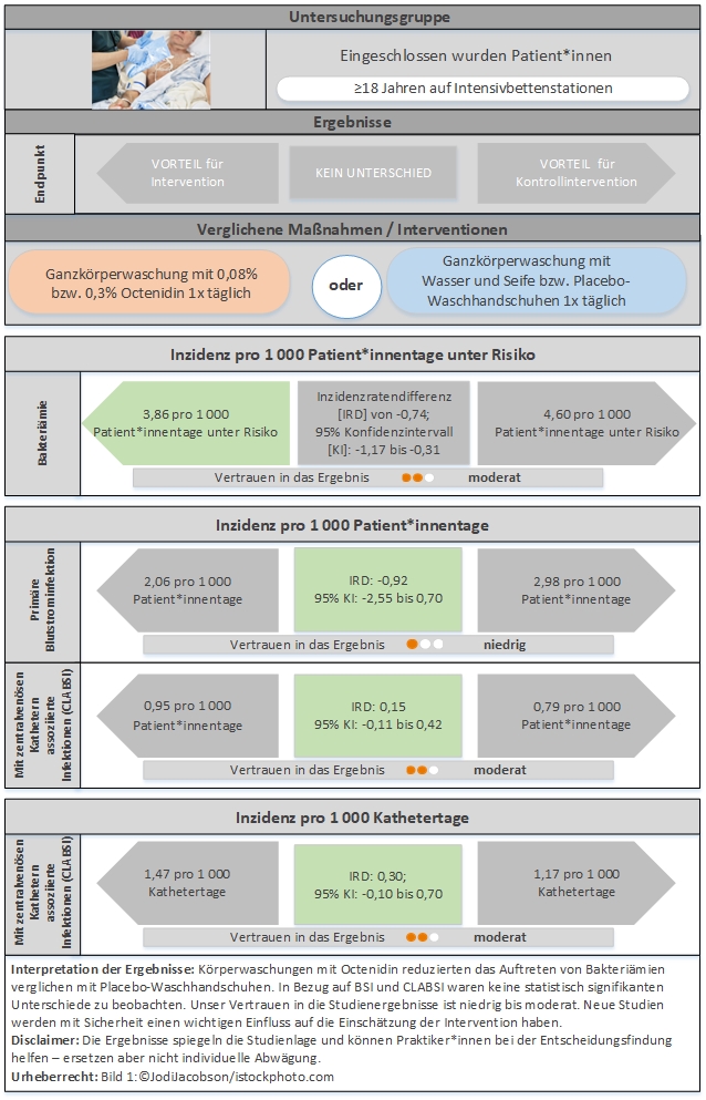 Körperwaschungen mit Octenidin-haltigen Waschhandschuhen reduzierten das Auftreten von Bakteriämien verglichen mit Placebo-Waschhandschuhen. In Bezug auf BSI und CLABSI waren keine statistisch signifikanten Unterschiede zu beobachten. Unser Vertrauen in die Studienergebnisse ist niedrig bis moderat. Neue Studien werden mit Sicherheit einen wichtigen Einfluss auf die Einschätzung der Intervention haben.